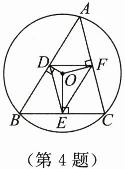 4. (新素养 运算能力)(2023·内蒙古包头)如图,$\odot O$是锐角三角形ABC的外接圆,$OD⊥AB$,$OE⊥BC$,$OF⊥AC$,垂足分别为D,E,F,连接DE,EF,FD.若$DE+DF= 6.5$,$\triangle ABC$的周长为21,则EF的长为 (