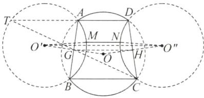 A 解析:如图,作等圆⊙O',⊙O",易得⊙O'与⊙O关于直线AB对称,⊙O"与⊙O关于直线DC对称,连接O'O",OO',OO",则OO'⊥AB,OO"⊥DC。令G为AB与OO'的交点,H为DC与OO"的交点,则G为弦AB的中点,H为弦DC的中点。所以AG=BG。连接GH,CG,并延长CG交DA的延长线于点T。因为AT//BC,所以∠TAG=∠CBG,∠T=∠BCG。所以△ATG≌△BCG(AAS)。所以AT=BC,TG=CG。所以G为TC的中点。又BC=8,所以AT=8。又AD=6,所以TD=14,即GH=$\frac{1}{2}$TD=7。在△O'OO"中,G为O'O的中点,H为OO"的中点,所以O'O"=2GH=14。连接O'M,O"N。又⊙O的半径为5,则O'M=O"N=5。又MN+O'M+O"N≥O'O",所以MN≥14−5−5=4。则MN的长的最小值为4。
