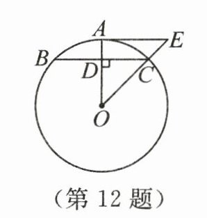 12. (2023·北京)如图,OA是$\odot O$的半径,BC是$\odot O$的弦,$OA⊥BC$于点D,AE是$\odot O$的切线,AE交OC的延长线于点E.若$∠AOC= 45^{\circ },BC= 2$,则线段AE的长为______