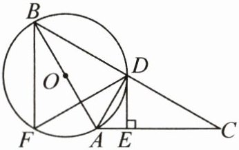 (1) 连接 OD.因为$OA=OD$,所以$∠BAD=∠ODA$.又$∠BAD=∠BFD$,$∠DAE=∠BFD$,所以$∠BAD=∠DAE$,即$∠ODA=∠DAE$.所以$OD// AC$.又$DE⊥AC$,所以$DE⊥OD$.又 OD 是$\odot O$的半径,所以直线 DE 是$\odot O$的切线.