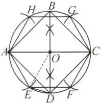 (1) 如图,作法如下:① 连接 AO 并延长,交$\odot O$于另一点 C;② 作 AC 的垂直平分线,交$\odot O$于 B,D 两点;③ 顺次连接 A,B,C,D 四点,四边形 ABCD 即为$\odot O$的内接正方形;④ 分别以 A,C 两点为圆心,OA 的长为半径作弧,交$\odot O$于 E,H,F,G 四点;⑤ 顺次连接 A,E,F,C,G,H 六点,六边形 AEFCGH 即为$\odot O$的内接正六边形.