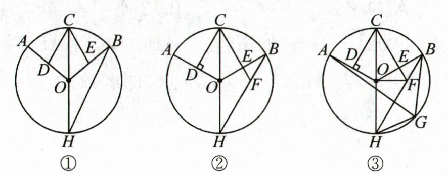 (3) 如图③,G 是$\widehat {BH}$上一点,连接 AG,BG,HG,OF. 在(2)的条件下,若$AG:BG= 5:3,HG= 2$,求 OF 的长.