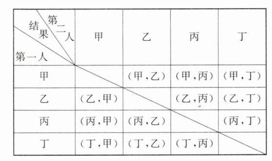 由表格,得共有12种等可能的结果,其中甲、乙两人中至少有1人被选中的结果有10种,所以$P$(甲、乙两人中至少有1人被选中)$=\frac{10}{12}=\frac{5}{6}$。