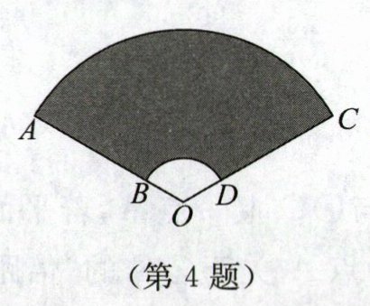 4. (2024·山东东营)习近平总书记强调,中华优秀传统文化是中华民族的根和魂.东营市某学校组织开展中华优秀传统文化成果展示活动,小慧同学制作了一把扇形纸扇.如图,OA= 20cm,OB= 5cm,纸扇完全打开后,外侧两竹条(竹条宽度忽略不计)的夹角∠AOC= 120°,现需在扇面一侧绘制山水画,则山水画所在纸面的面积为 (
