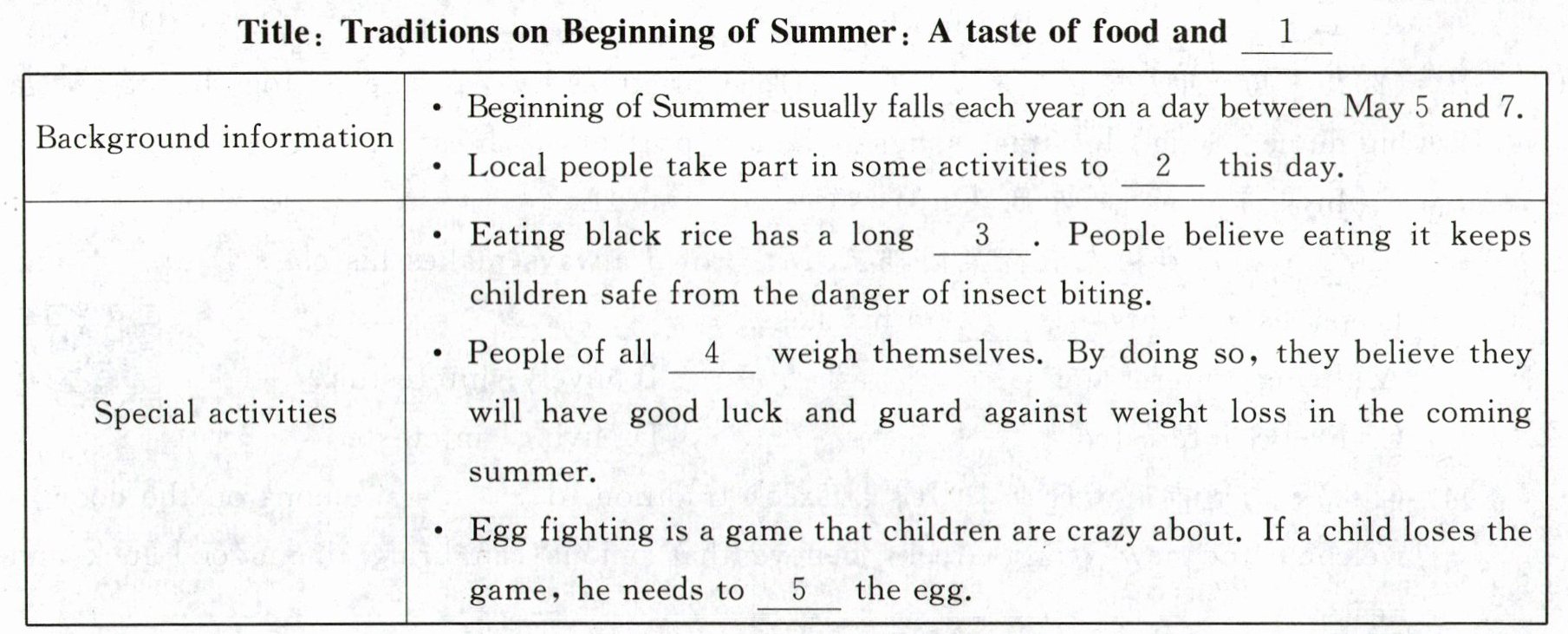Eating black rice: A few days before Beginning of Summer, people begin cooking black rice. They mix rice and the juice of fresh-picked sea bilberry leaves. The culture started from the Tang dynasty. It is believed that children who eat black rice will not be bitten by insects the whole summer.