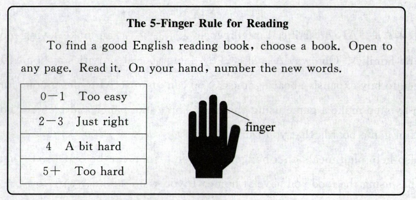 Pick a book that is not too hard for you. Use the “5-finger rule” to find out. Open a page and read it. If you find five or more words on the page that you don’t know, the book may be too difficult. Pick a book with only a few new words, so you can read it quickly and enjoy the story.
