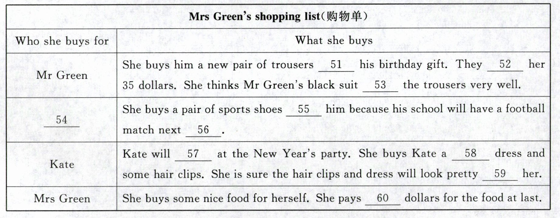 51. as 52. cost 53. matches 54. Jim 55. for 56. weekend 57. dance 58. pink 59. on 60. 48/forty-eight