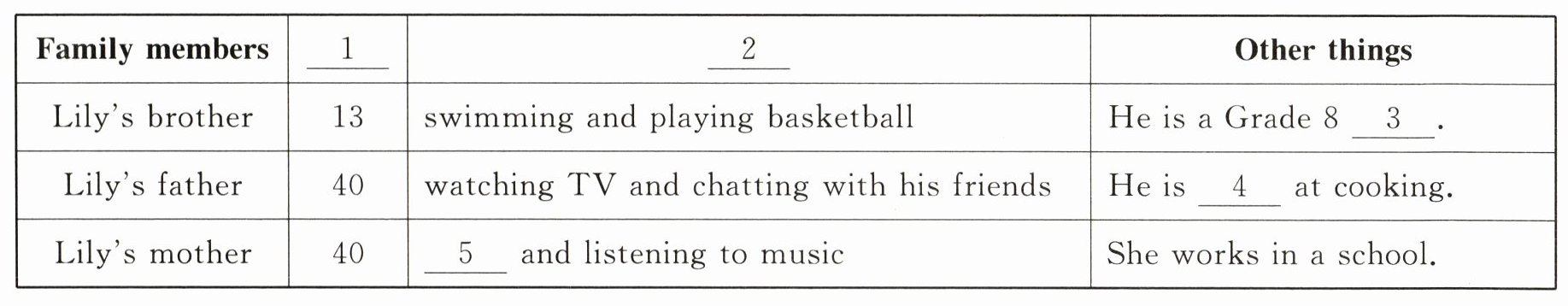 Thank you for telling me about your family.Let me tell you about my family.You know I have a brother and he is 13 years old.He is in Grade 8.He likes swimming very much.My brother is very tall and he plays basketball very well.My father is 40 years old.He is a good cook.He works in a very big restaurant and he works hard.He likes watching television and chatting with his friends.My mother is 40 years old too.She is a teacher.She teaches children.She likes to read books and listen to music.She can sing very well.