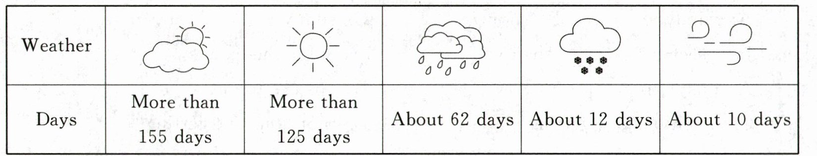 1. Because the weather changes a lot. 2. About 62 days. 3. By making them know what to wear on that day. 4. To help animals. 5. I think the work in the weather station is hard but important.(言之有理即可)