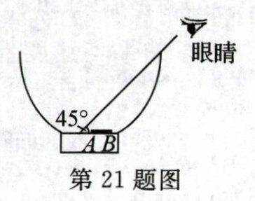 21. 新素养 科学思维 小伟将装有一枚硬币的碗放在水平桌面上,调整视线至如图角度,沿碗壁缓慢注水,当水面到达 MN(图中未画出)时,刚好看到硬币 A 端,这是由于光的______;当水面到达碗口时,刚好看到硬币 B 端,看到的“硬币”是______像;水面从 MN 到碗口上升的距离 H______硬币的直径.
