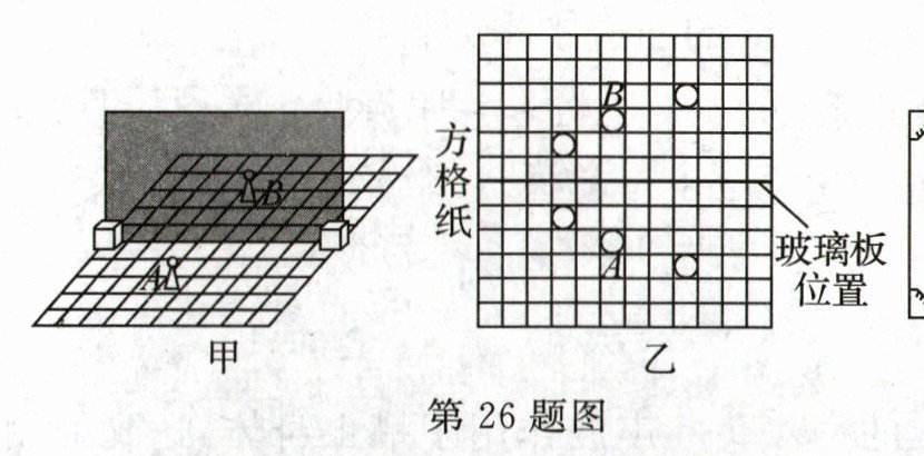 26. (10 分)探究平面镜成像的特点,器材有:茶色玻璃板、方格纸、棋子、白卡片、铅笔、刻度尺.