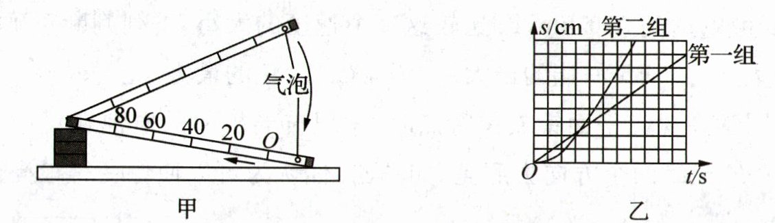 (选填“快”或“慢”)一些.(3) 如图乙所示是第一组和第二组根据各自实验记录的数据在同一张坐标纸中作出气泡的运动的 s-t 图像.