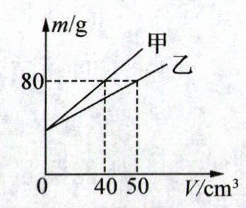 C 解析:由图可知,甲中装入$40\ \text{cm}^3$水时的总质量为80g,其中水的质量$m_水=\rho_水V_水=1.0\ \text{g/cm}^3×40\ \text{cm}^3=40\ \text{g}$,则空烧杯的质量$m_杯=m_甲-m_水=80\ \text{g}-40\ \text{g}=40\ \text{g}$,故A错误;由图可知,乙中装入$50\ \text{cm}^3$另一种液体的质量$m_液=m_乙-m_杯=80\ \text{g}-40\ \text{g}=40\ \text{g}$,则另一种液体的密度$\rho_液=\frac{m_液}{V_液}=\frac{40\ \text{g}}{50\ \text{cm}^3}=0.8\ \text{g/cm}^3$,故B错误;甲、乙都装满后,由于烧杯相同,水的密度大于乙中液体的密度,所以甲的总质量大于乙的总质量,$m_甲=m_杯+\rho_水V=40\ \text{g}+1.0\ \text{g/cm}^3× V$,$2m_乙=2m_杯+2\rho_液V=80\ \text{g}+1.6\ \text{g/cm}^3× V$,可知$m_甲<2m_乙$,故C正确;当烧杯内装$50\ \text{cm}^3$水时,$m_水'=\rho_水V_水'=1.0\ \text{g/cm}^3×50\ \text{cm}^3=50\ \text{g}$,其总质量为50g + 40g = 90g,故D错误。