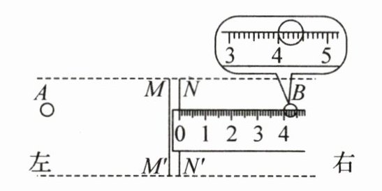 (3) 在白纸上沿棋子A和B的边缘画图,测量A的右端到MM'的距离l_A= 4.30cm;测量B的左端到NN'的距离如图所示,其值l_B=