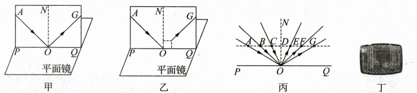 (3) 经多次实验,在纸板上画出入射光线和对应的反射光线后,利用刻度尺在白纸板上作了一条平行于平面镜的直线,$ A、B、C、E、F、G、D $ 是直线与各入射光线、反射光线、法线的交点,如图丙所示,测量发现:$ AD = GD,BD = FD,CD = ED $,这样的发现