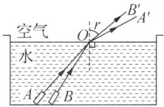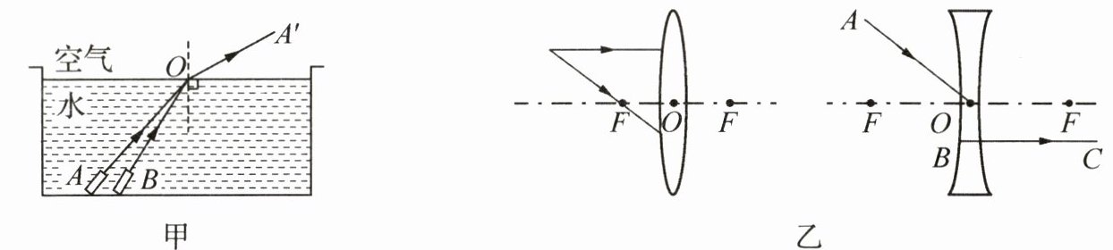(1) (2024·河南)如图甲,观光水池中,一束红光沿AO方向从水中射入空气中,折射光线为OA'.若另一束红光沿BO方向从水中射入空气中,请大致画出入射光线BO的折射光线,并标出对应的折射角r.