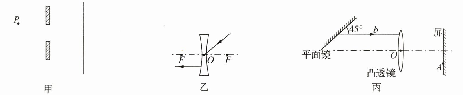 (3) (2024·广东广州改编)如图丙,光线 $ a $(图中未画出)射到平面镜上,其反射光线 $ b $ 平行于凸透镜的主光轴,$ b $ 经凸透镜折射后,射到屏上的 $ A $ 点.请画出入射光线 $ a $,并标出透镜右侧焦点 $ F $;保持入射光线 $ a $ 不变,绕入射点转动平面镜,画出使反射光线过凸透镜光心 $ O $ 时的平面镜的位置.