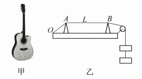 24. 新趋势 创新实验(6 分)小明想给吉他调节音准,如图甲所示,他决定先探究琴弦发声的音调与哪些因素有关,并设计了如图乙所示的实验装置.在一块厚木板上放置 $ A $、$ B $ 两个楔支撑琴弦,其中 $ A $ 楔固定,$ B $ 楔可沿木板移动以改变琴弦振动部分的长度,将琴弦的末端固定在木板 $ O $ 点,另一端通过滑轮悬挂不同个数的相同重物(重物个数越多,琴弦绷得越紧),轻轻拨动 $ A B $ 间的琴弦使其振动发声,并用仪器测出发声频率.