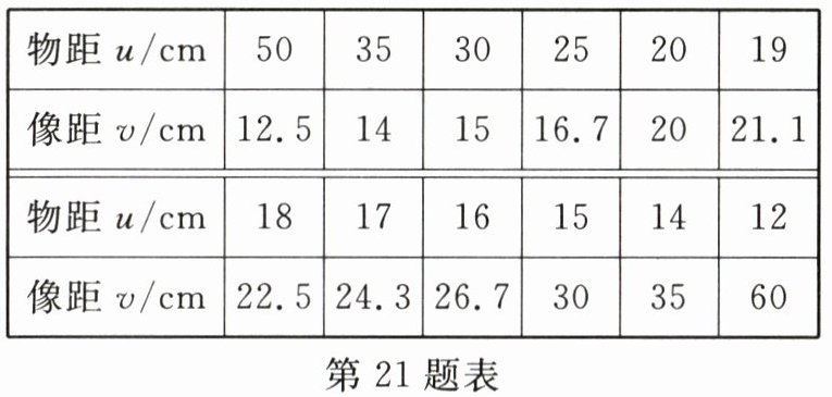 21. (2025·江苏连云港月考)小明探究“凸透镜成像的规律”,通过实验得到了如表所示的实验数据,可知实验所用凸透镜的焦距为