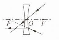 (2) 如图乙所示,$ F $ 为透镜的虚焦点,请作出与已知光线对应的入射光线和折射光线.