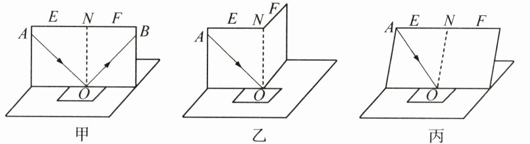 (2) 入射光线贴着左边的纸板 $ E $ 射到 $ O $ 点,如果把右边纸板 $ F $ 沿 $ O N $ 向后折(如图乙),发现右边纸板上看不到光线,则此时反射光线