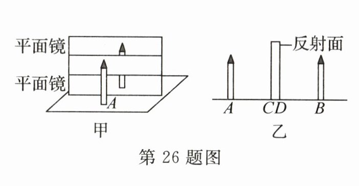 (1) 如图甲所示,小明将两块平面镜分开一定距离固定于不锈钢框架上,将铅笔 $ A $ 放在平面镜前,可以看见铅笔通过平面镜成上下两段不完整的像,此像虽然不完整,但比玻璃板成的像要______