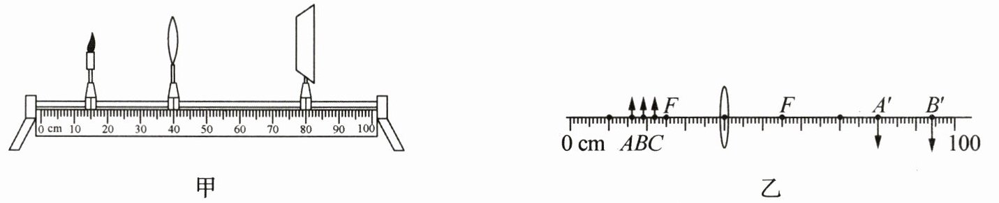 28. (10 分)某小组同学用如图甲的装置探究“凸透镜成像的特点”,凸透镜的焦距为 $ 15 \mathrm { cm } $.他们进行实验的同时在纸上记录蜡烛与光屏上像的位置和大小,如图乙.(用带箭头的线段表示物或像,$ A ^ { \prime } $、$ B ^ { \prime } $ 分别表示蜡烛在 $ A $、$ B $ 处时像的位置)