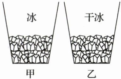 8. 小组同学做对比实验,如图所示,在甲、乙两个相同杯子中分别放入适量的冰块和干冰块.放置一段时间后,发现杯内物块均变小.甲杯内有液体出现,外壁有小水珠生成;乙杯内仍然是干燥的,外壁有一层薄霜生成.下列分析正确的是 (