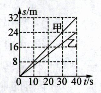 B 解析:由图像可知,当$t_{甲}=t_{乙}=40s$时,$s_{甲}=32m$,$s_{乙}=24m$,则$v_{甲}=\frac{s_{甲}}{t_{甲}}=\frac{32m}{40s}=0.8m/s$、$v_{乙}=\frac{s_{乙}}{t_{乙}}=\frac{24m}{40s}=0.6m/s$,故$v_{甲}>v_{乙}$。由题意知,甲、乙两车在同一直线上的M、N两点(M、N间距为30m)同时同向出发做匀速直线运动,经过时间t,甲、乙相距10m(即两车间的距离缩小了),且$v_{甲}>v_{乙}$,说明是速度较快的甲车去追速度较慢的乙车,甲、乙相距10m时有两种情况:一是甲、乙两车相遇之前相距10m,二是相遇之后相距10m。若甲、乙两车相遇之前相距10m,则有$v_{甲}t - v_{乙}t=30m - 10m$,即$0.8m/s×t - 0.6m/s×t=20m$,解得$t=100s$;若甲、乙两车相遇以后相距10m,则有$v_{甲}t - v_{乙}t=30m + 10m$,即$0.8m/s×t - 0.6m/s×t=40m$,解得$t=200s$;所以t可能为100s,也可能为200s。综上所述,B正确。