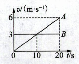 B 解析:由图像知,A同学做加速运动且速度与时间成正比,所以0~20s的平均速度$v=\frac{1}{2}v_1=\frac{1}{2}×6m/s=3m/s$,B同学的速度保持3m/s不变,做匀速直线运动,所以A的平均速度等于B的速度,但无法知道二者的出发地点是否相同,故A、D错误;由图像知,0~10s,A的速度比B的小,以A为参照物,B向前运动,10~20s,A的速度比B的大,以A为参照物,B向后退,所以以A同学为参照物,B同学总是运动的,故B正确;0~20s内,A同学的平均速度与B同学的速度相同,由$s=vt$可知,二者通过的路程相等,故C错误。