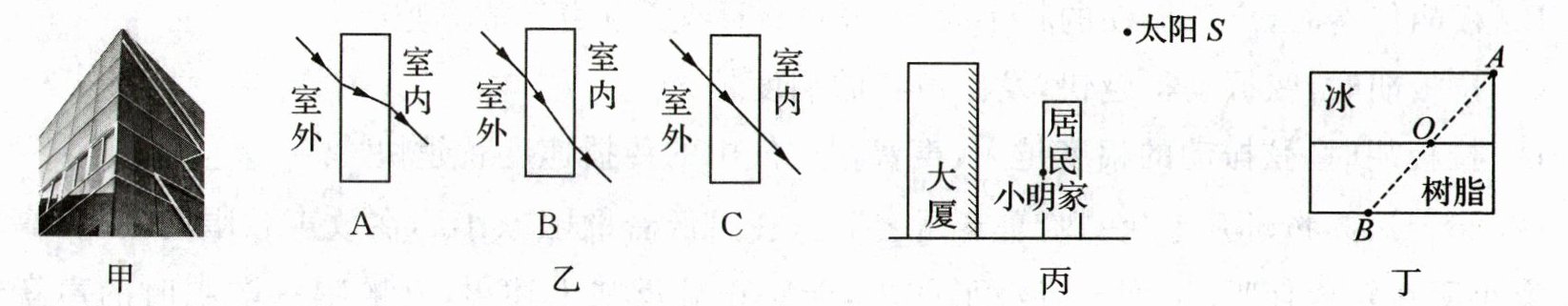 (2) 如图乙A、B、C三幅图中,能真实反映太阳光线通过玻璃幕墙进入室内传播途径的是
