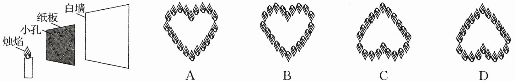 7. (2025·江苏泰州月考)如图所示,在一个纸板上打若干个小孔,组成一个心形.在较暗的室内让这个纸板在烛焰和白墙之间移动,在墙上能看到的图案是 (