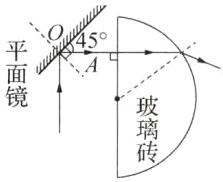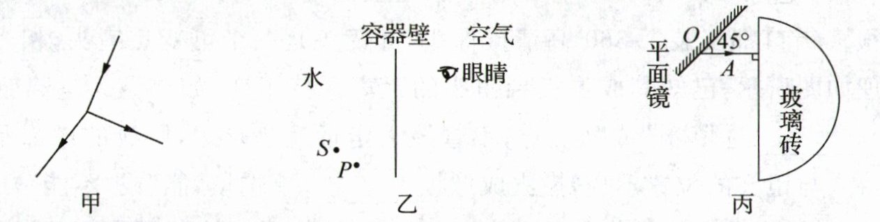 (3)如图丙所示,平面镜与水平方向成$45^{\circ }$角,OA 是光线经过平面镜反射后的反射光线,请画出 OA 对应的入射光线,并将光线 OA 穿过半圆柱形玻璃砖后的光路补充完整.