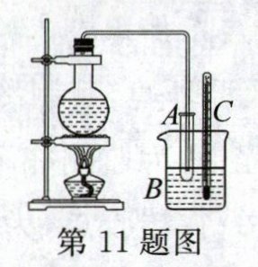 11. 如图,烧瓶内水沸腾时产生的水蒸气通入试管 $ A $ 中,$ A $ 放在装冷水的容器 $ B $ 内,过一段时间看到 $ A $ 中出现