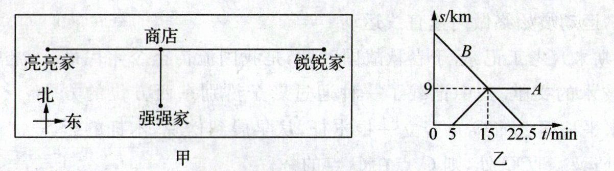 (1)15 m/s (2)27 km (3)14 m/s 解析:(1)由图乙可知,在5~15 min内小车A行驶的距离为9 km,则在5~15 min小车A的速度$v_{A}=\frac {s_{A}}{t_{A}}=\frac {9km}{\frac {15-5}{60}h}=54km/h=15m/s$.(2)由图乙可知,小车B做匀速直线运动,小车B的速度$v_{B}=\frac {s_{B}}{t_{B}}=\frac {9km}{\frac {22.5-15}{60}h}=72km/h=20m/s$,从出发到两车相遇,小车B行驶的路程$s_{B}'=v_{B}t_{B}'=20m/s×15×60s=18000m=18km$,则锐锐家到商店的距离为18 km,而亮亮家到商店的距离为9 km,所以,亮亮家与锐锐家相距18 km+9 km=27 km.(3)设强强爸爸从家出发去商店时的车速为$v_{车}$,由$v=\frac {s}{t}$可得,强强爸爸从家出发到接上亮亮和锐锐他们,有$s_{商强强家}=v_{车}t'+v_{亮锐}t'$,即$5.4×10^{3}m=v_{车}t'+1m/s×t'$①;从接上他们到回到家,有$s_{商强强家}-v_{亮锐}t''=v_{车}t''=1.2v_{车}t''$②;又因为$t'+t''=11×60s=660s$③.联立①②③,解得强强爸爸从家出发去商店时的车速$v_{车}=14m/s.$