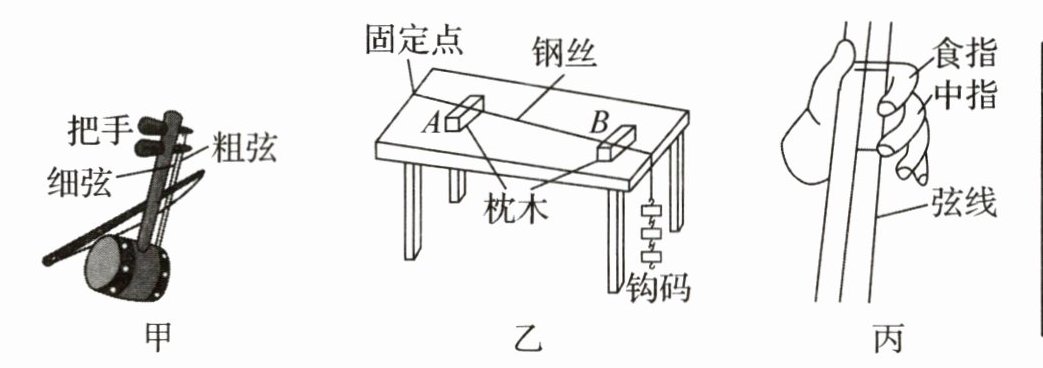 (选填“粗”“细”或“粗细均可”)钢丝.(3)二胡演奏时可通过手指按压、松开、滑动等指法配合产生优美旋律.图丙中小明食指按压的是音符“3(mi)”位置,中指按压的是音符“4(fa)”位置,为了发出“5(so)”音符,他可以做如下操作: