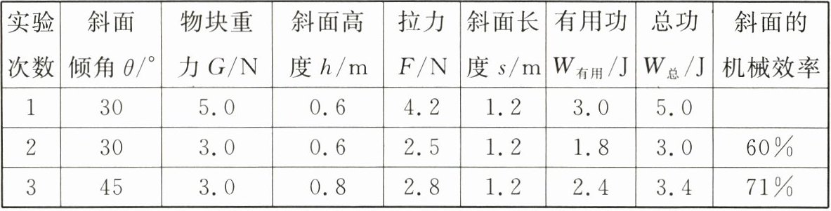 |实验次数|斜面倾角θ/°|物块重力G/N|斜面高度h/m|拉力F/N|斜面长度s/m|有用功$W_{有用}/J$|总功$W_{总}/J$|斜面的机械效率|