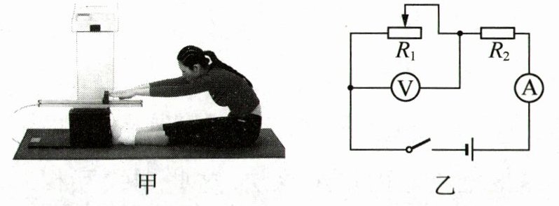 (1) 图甲中测试者向前推动测试仪的滑块,相当于图乙中 $ R_{1} $ 的滑片向 (选填“左”或“右”)移动,应该用 (选填“电流”或“电压”)表的示数反映测试者的成绩;图乙中的电阻 $ R_{2} $ 起到 的作用.
