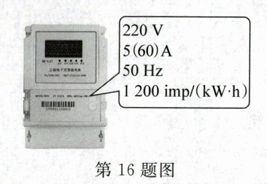 16. 如图所示是小明家里的电能表,根据表盘参数可知:该电能表指示灯每闪烁一次电路消耗电能______J.他关闭家中其他用电器,只让电水壶正常工作,指示灯闪烁了32次,测得用时正好1 min,则该电水壶的实际电功率为______W.