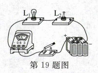 19. 小明将灯$L_1、$$L_2$串联在电路中,闭合开关后两灯均发光,电流表示数为$I_1.$为探究灯丝电阻是否随温度变化,他将$L_2$灯珠的玻璃泡摘除,如图所示.再次闭合开关后,发现$L_2$不亮,但$L_1$比之前更亮,电流表示数为$I_2,$可得$I_1______I_2.$对$L_2$灯丝加热,发现$L_1$变暗,由此可知灯丝温度升高,电阻______.依据上述结论,分析$L_2$不亮的原因是______.
