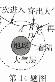 14. 新趋势 情境素材 我国嫦娥五号返回器用类似"打水漂"的方式着陆地球,其着陆过程的部分轨迹简化为如图所示,AB段返回器的动能______;BC段返回器的机械能______,采用这种方式着陆的目的是______.