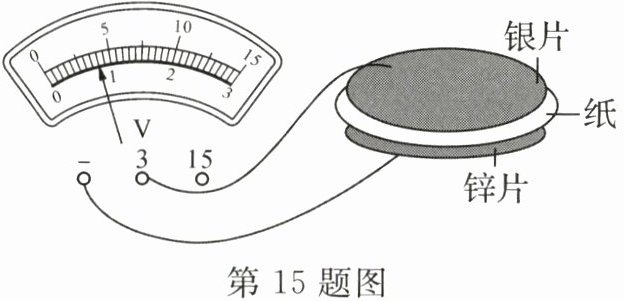 15. 如图所示,小明自制了一个伏打电池,则______片是电池正极,电压为______V,银片和锌片之间的纸要浸有______.