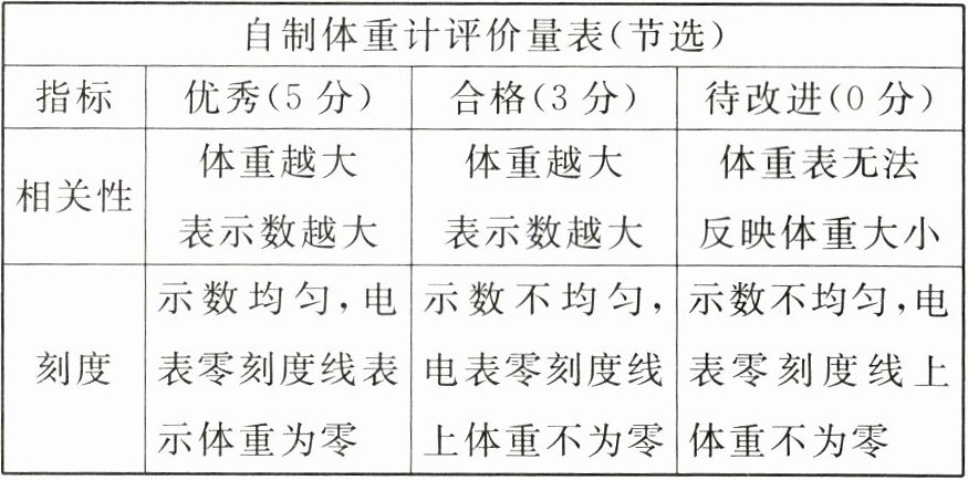 (2)请你结合老师给出的"自制体重计评价量表"给该装置评价,该体重计指标:______.