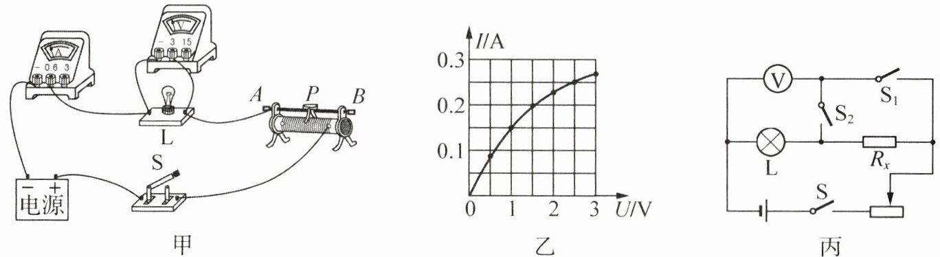 (4)如图丙,小亮用该小灯泡和电压表测未知电阻Rₓ的阻值.步骤如下:① 断开$S_1,$只闭合S、$S_2,$移动滑片,使电压表示数为1 V;② 保持滑片位置不变,______,读出电压表示数为2.8 V;③ Rₓ的阻值为______Ω.