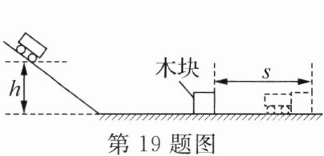 19. 如图所示是"探究动能的大小与哪些因素有关"的实验装置.为探究动能大小与质量的关系,可行的方法是:将质量______(选填"相等"或"不等")的两辆小车从斜面的______(选填"相同"或"不同")高度由静止释放,通过观察______来判断小车撞击木块前动能的大小,此次实验可解释汽车______(选填"超速"或"超载")带来的危害.