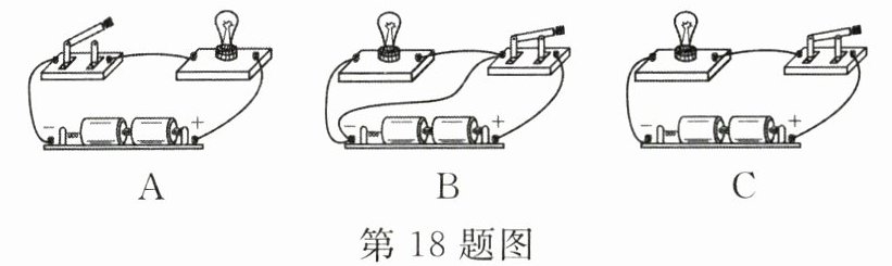 18. 如图所示的A、B、C三个电路中,器材均完好,且连接紧密.处于通路状态的是______图;出现短路的是______图,该状态会导致电路中的______(选填"电池"或"灯泡")损坏.