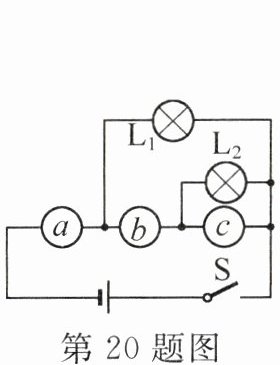 20. 如图,a、b、c是电压表或电流表,闭合开关后,两个灯泡并联且均能正常发光,已知a、b、c三个电表读得的数值依次为1.5、1.2、2.5(单位是A或V).可知a为______表,电源电压为______V,通过$L_1$的电流是______A.