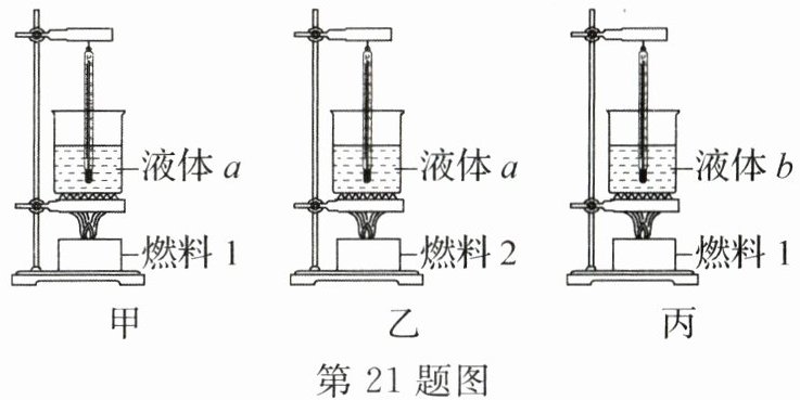 21. 如图所示,甲、乙、丙三图中的装置完全相同,燃料及烧杯内的液体质量也相同.