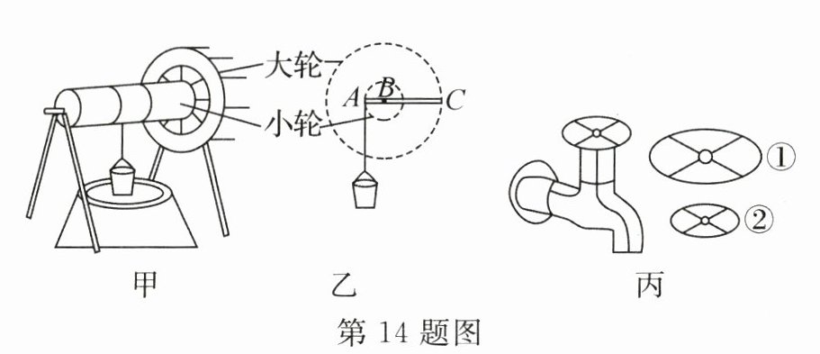 14. 如图甲是《天工开物》中记载的农业生产汲水装置——辘轳,图乙是它提水时的示意图,为方便提水,应按照______(选填“省力”或“费力”)杠杆来设计,支点是______(选填“A”“B”或“C”)点;图丙中水龙头开关也应用了同样原理,开关选用______(选填“①”或“②”)更省力.