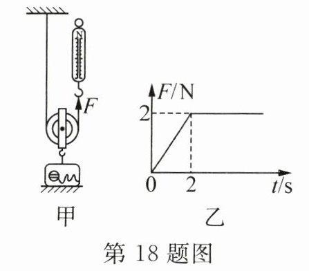 18. 小明用动滑轮将静止在桌面上的笔袋慢慢匀速向上提高 10 cm,如图甲所示,弹簧测力计的读数随时间的变化如图乙.已知动滑轮重为 1 N,不计绳重和摩擦,则笔袋的重力为______N,动滑轮的机械效率为______;若在笔袋中取出一块橡皮,动滑轮的机械效率将______.